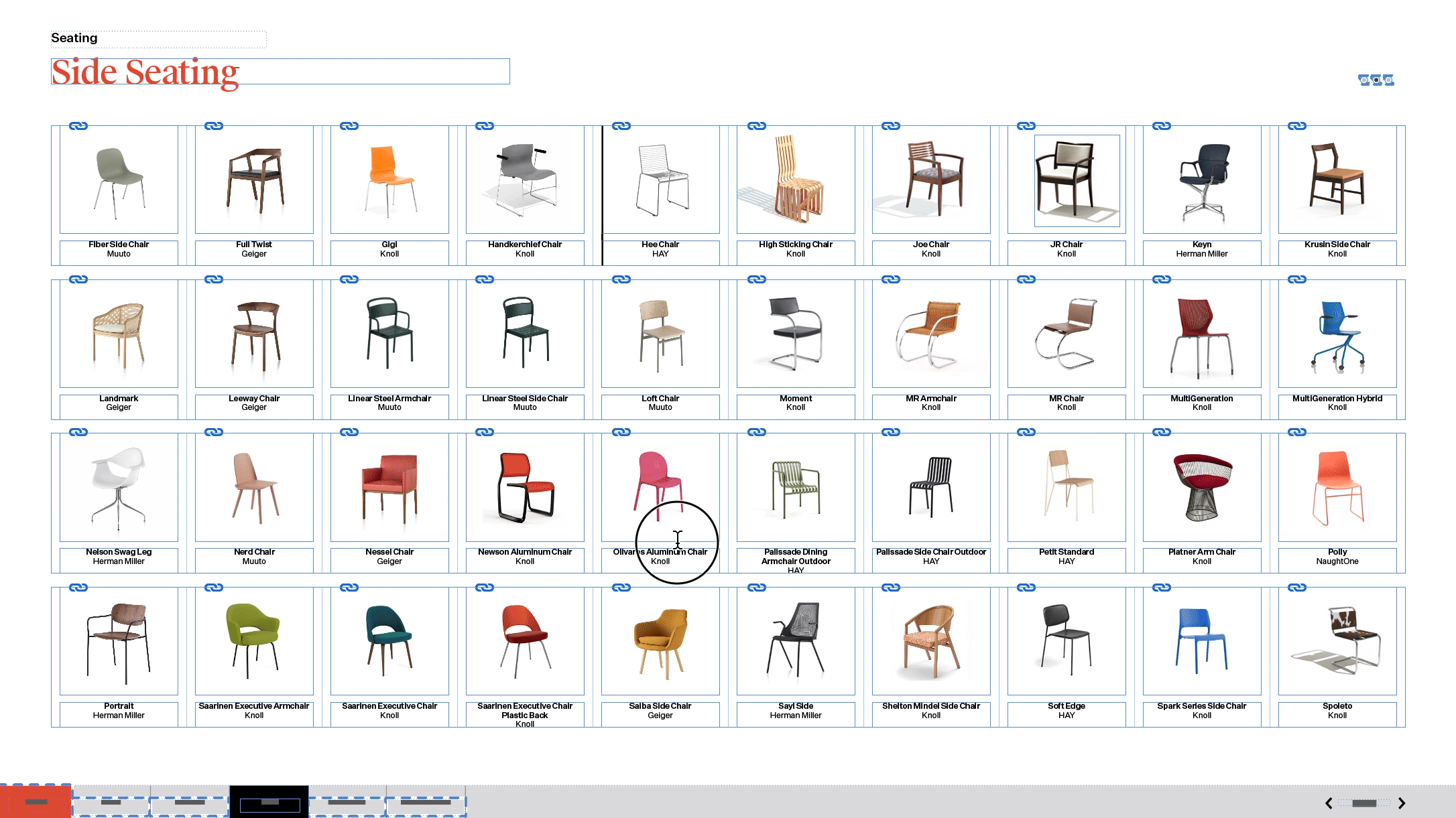 We often have to catalogue and alphabetize every piece of furniture in a proposed solution, or for whole industries like healthcare (or once, the entirety of the MillerKnoll collection via iPDF). These projects can be tedious and take up an exorbitant amount of time. They can also be hard to update—if a single product is discontinued, deleting it creates a gap and fixing it could affect several pages. To ease the weight of these projects, I proposed a new method of setting up our files using text frames. This has cut down hours of design time.